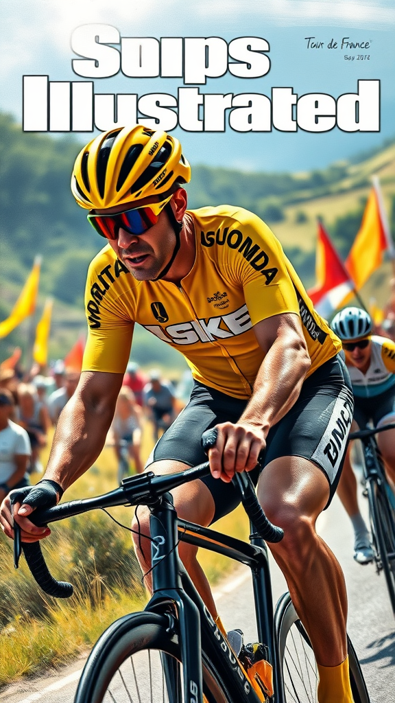 A photorealistic drawing of a Sports Illustrated cover featuring a cyclist in the iconic Yellow Jersey of the Tour de France, capturing the intensity of the competition with a backdrop of the French countryside. The cyclist is depicted in a dynamic pose, showcasing muscular determination and focus, sweat glistening under the crisp sunlight. The bike has a sleek design, and small crowd details can be seen in the background, cheering with flags, adding to the atmosphere. The air is filled with a sense of speed, with motion lines subtly suggesting movement. Enhanced colors and contrast emphasize the drama of the scene, encapsulating the spirit of the Tour de France.