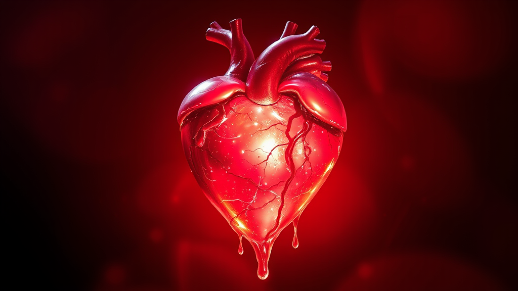 A photorealistic fantasy concept art of a luminescent heart slowly melting, casting ethereal glows on a rich red-black gradient background. The dynamic lighting enhances the intricate details, with an emphasis on cinematic depth and stunning visuals. Inspired by the styles of Artgerm, Greg Rutkowski, Peter Mohrbacher, and Guweiz, the piece captures an enchanting fusion of light and shadow, with a mythic, almost otherworldly allure. The heart pulses with life, its radiant core illuminating the dark, creating an immersive scene of poignant beauty and imaginative depth.