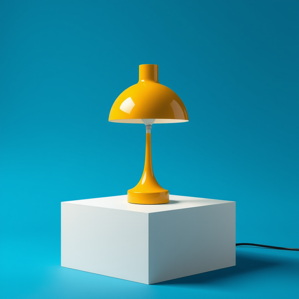 A photorealistic front view capture of a Louis Poulsen Panthella 250 table lamp rendered in high detail, using a Nikon D850 with a Nikon AF-S Micro-Nikkor 60mm f/2.8G ED lens set to an aperture of f/8, ISO 100. The lamp, sleek, yellow, and reflective, is positioned on a pristine white 45-degree square box in a photo studio setup. The scene is set against a deep blue solid color background. Studio lighting, including a square soft box, bathes the lamp in realistic sunlight-like illumination, enhancing the contrast. The composition is crafted for optimal shape and detail, captured in stunning 8K UHD quality, avoiding any strange shapes, text, typography, plants, cropping, small details, or thin lines that might detract from the overall imagery.