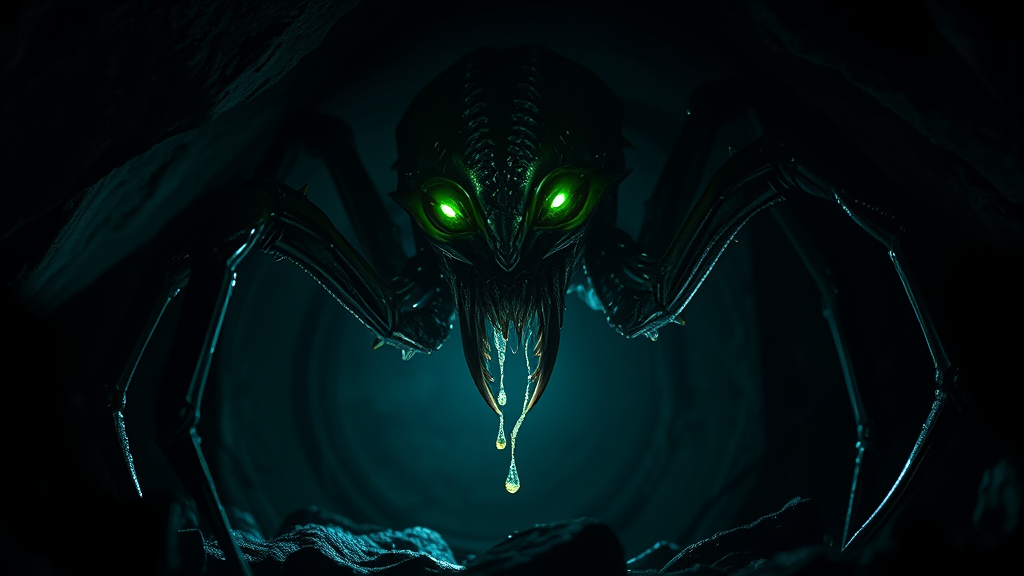 A photorealistic full body image of a terrifying alien creature resembling a humanoid spider, with glistening venom dripping from its fanged mouth, stealthily emerging from the shadows of a dimly lit cave. Its piercing green eyes exude a deadly glow, casting an eerie light across its intricately designed exoskeleton. The creature's form is captured with cinematic detail, set against a backdrop of utter darkness that enhances its horror. The scene is illuminated with dramatic lighting, highlighting the creature's elaborate features and textures, creating a hauntingly cinematic atmosphere in high-resolution 8k quality, with subtle cinematic noise enhancing the gritty realism. The aspect ratio is a vertical 9:16, emphasizing the creature's formidable presence.