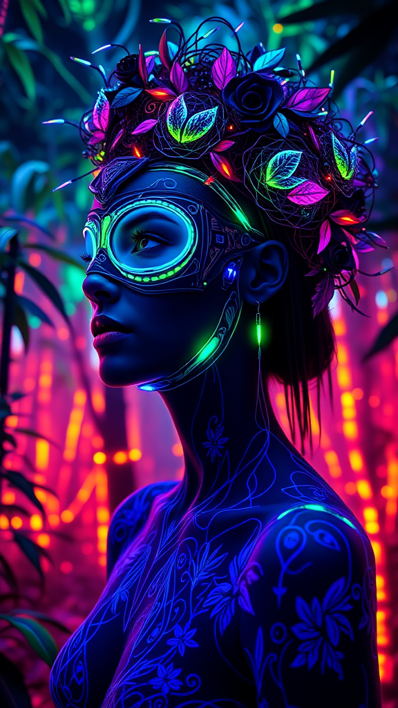 A photorealistic, full-body portrait of a woman is framed in a stunning asymmetric composition as she gazes thoughtfully into the distance. She embodies a fusion of lucid weirdcore and cybercore aesthetics, with her skin revealing bioluminescent, intensely glowing biomechanical patterns that shimmer in hues of blue, green, and purple. Her visage is partially concealed by a mask crafted from intricate fibre-optic strands, emitting vibrant neon lights that dance across her features. Her headdress, styled as if drawn from the pages of an intricately detailed folio, teems with fantastical marginalia, serving as a crown of chaotic artistry. She stands amidst a glowing forest—a vivid neon wonderland drenched in dreamlike particles of light, where every leaf pulses with life in a symphony of vivid colors. The surreal backdrop accentuates the mood of a colorful, transcendent realm. The environment is rendered with octane-level precision, employing raytraced shadows and a refined depth of field to enhance the scene’s cinematic realism. The overall composition follows the rule of thirds and golden ratio, embracing hypermaximalist detail that fascinates and captivates, like a visual tapestry woven from strands of unreal engine creativity. Rendered in 8k, the image sparks with the vibrance of an extraordinary reality, where each element, from the woman’s expressive form to the pulsating forest, tells a story in insane detail.