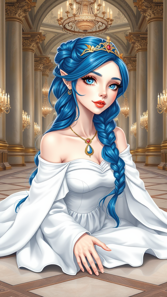 A photorealistic hyperrealism illustration of an elegant figure with a detailed face and mesmerizing blue eyes, flowing half-tied braid of long blue hair. She wears a delicate elven tiara and an intricate amulet that complements her off-shoulder white dress with long sleeves, accented by a white cloak. Her skin is pale milky white, showcasing an artistic design with a detailed intricate gold leaf circlet. Her physique features a tiny waist and thick thighs, matched with high heels. She's gracefully laying on the floor of a grand hall adorned with chandeliers and towering columns. The scene is a 3D masterpiece painting, blending illustration and cartoon styles. Her expression is serene with a closed mouth, depicting poise and elegance.