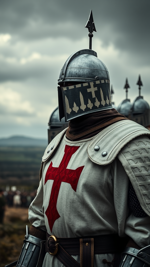 A photorealistic image captures the striking scene of a Templar knight's armor and helmet, featuring a white surcoat adorned with a bold red cross on the chest. This knight stands resolute among a line of fellow knights, each exuding a quiet determination before the impending battle. The background reveals a dramatic battlefield, stretching towards a horizon cloaked by a brooding, grey sky. The depth of field skillfully blurs the distant landscape, drawing focus to the knight's solemn expression and polished armor. Captured as if through a 50mm lens, the image subtly highlights the intricate details and textures of the armor, while a gentle, ethereal glow seems to emanate from the crosses, infusing the scene with an aura of mystique and reverence.