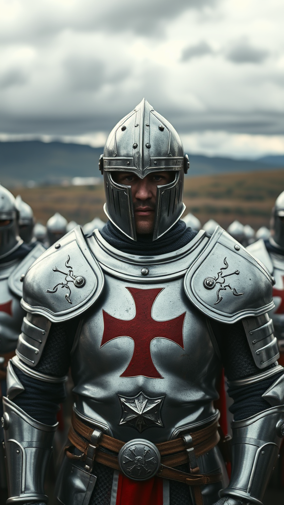 A photorealistic image capturing the armor and helmet of a Templar knight, gleaming in silvery white with a bold red cross emblazoned on the chest. The knight stands resolute among an assembly of warriors, each clad in similar majestic armor, preparing for the impending battle. Behind them, the vast expanse of the battlefield stretches under a brooding, cloud-laden sky. The image employs a shallow depth of field with a 50mm lens effect, drawing focus to the determined expressions of the knights in the foreground while the figures in the background subtly blur into the ominous scenery. The scene emanates a sense of bravery and imminent conflict, enhanced by the vibrant texture and detail of the armor, the intricate design of the helmets, and the muted yet dramatic lighting that bathes the landscape.