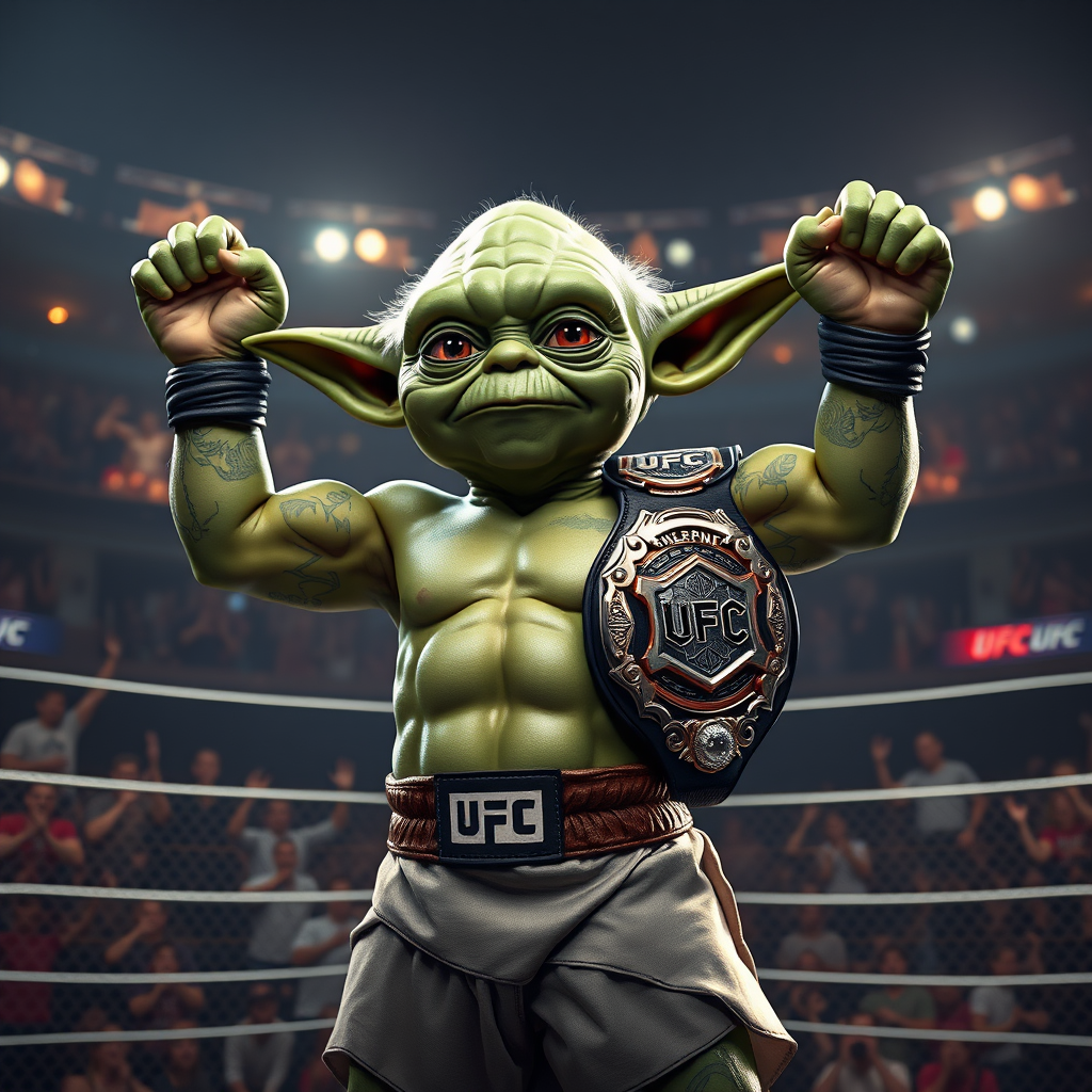 A photorealistic image depicting Yoda as a UFC champion, his small but muscular frame wrapped in traditional fight shorts, his green skin glistening under the arena lights. His wise eyes focused and intense, with a slight smirk of confidence. Intricate tattoos cover his arms, symbolizing his journey and mastery of the Force. He stands victorious in an octagonal ring with cheering fans in the background, holding a championship belt high. His pointed ears perked up in victory, conveying a mix of wisdom and warrior spirit.