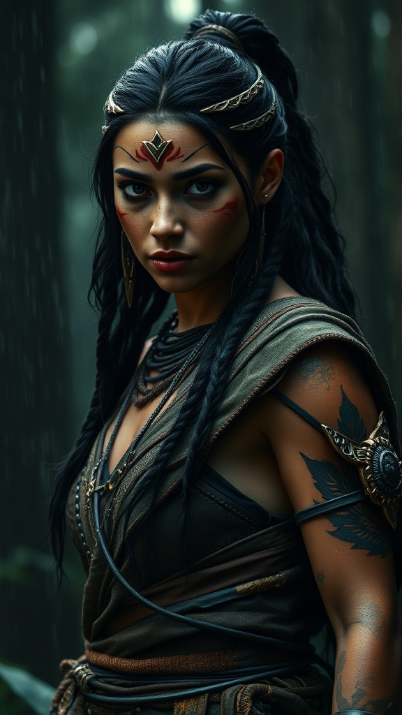 A photorealistic image of a captivating Amazon warrior with an intimate and alluring facial expression. Her handcrafted cloth outfit is adorned with intricate details, complemented by striking war paint. She stands in a dark woods setting, rain cascading down around her, adding to the dramatic atmosphere. The scene is illuminated by cinematic lighting, highlighting the warrior's fierce presence. Created using Unreal Engine 5 with RTX and ray tracing for hyper-realistic quality. Subtle creative modifications include a dynamic pose and hints of ancient jewelry. The scene exudes a sense of power and mystery, immersing the viewer in its vivid and lifelike essence.
