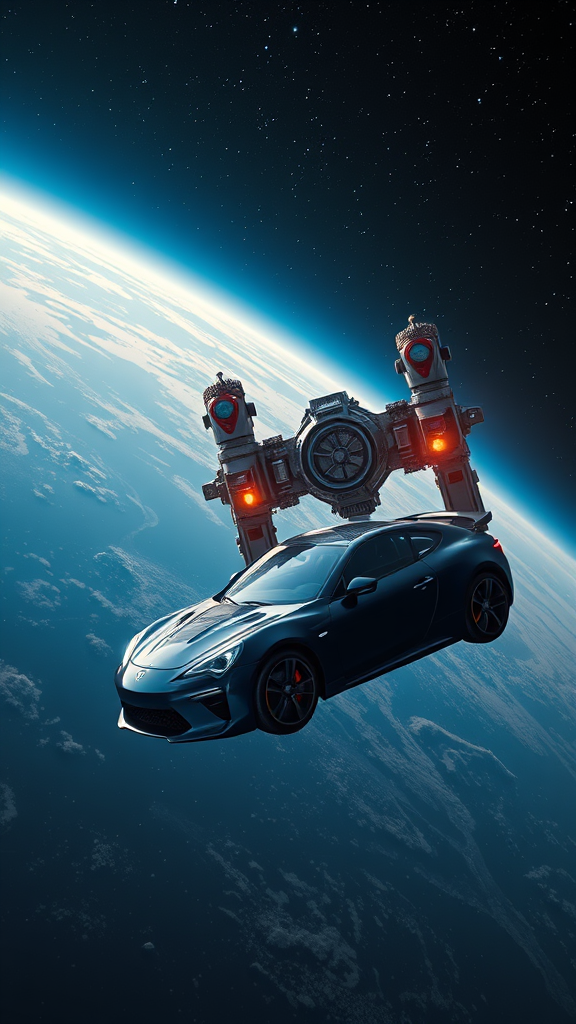 A photorealistic image of a dark blue car in a weightless state, seamlessly approaching a space station in deep space. The scene is filled with insane details, with the vast sky and twinkling stars, offering a stunning view of Earth from above. The composition highlights the intricate spaceship design, showcasing its elegance and complexity. In the background, two figures are visible with characteristic traits like Ironman-inspired features and biker elements, providing an artistic contrast to the cosmic scenery. Their expressions convey curiosity and adventure, as if on an interstellar journey. The scene avoids unnecessary distortions or abnormalities, focusing on creating an awe-inspiring, harmonious visual experience in 8k resolution.