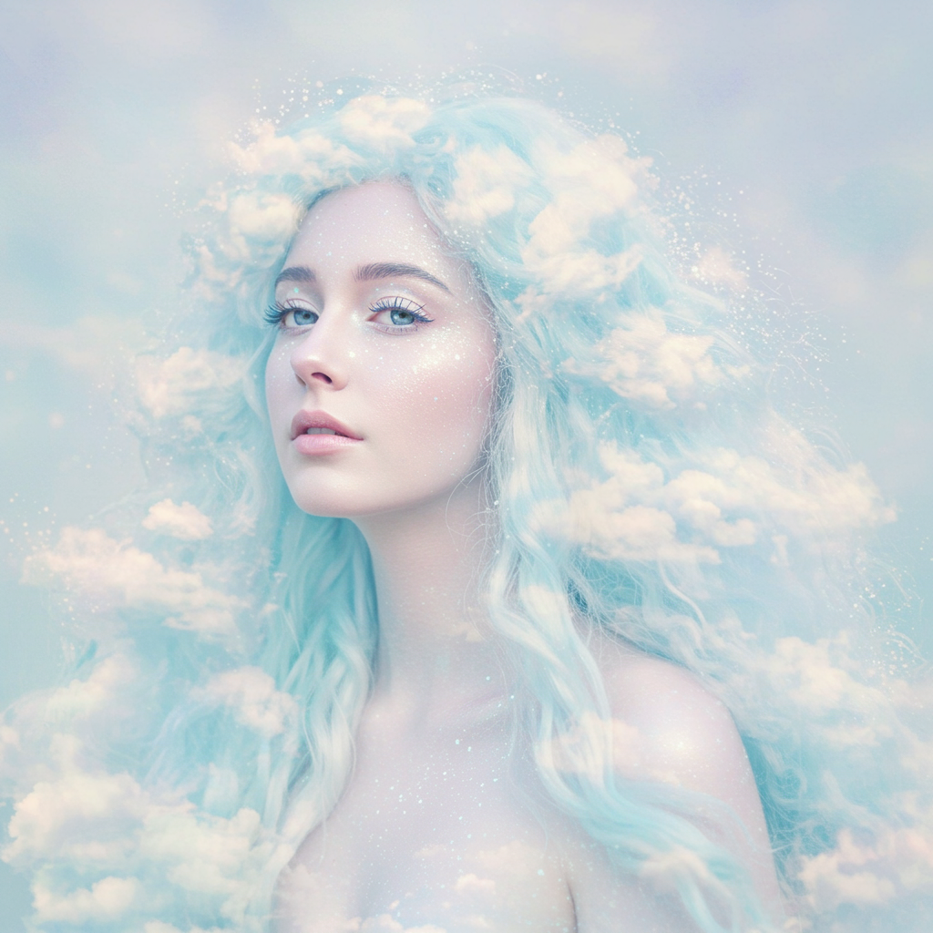 A photorealistic image of a fantasy sky queen with ethereal, flowing hair made of wispy clouds, illuminated by natural lighting. She has a serene expression, captured through a macro lens, showcasing intricate details reminiscent of Gerald Brom's style. The color palette features soft baby blue and mint hues, blending seamlessly with pastel and white elements, set against a delicate background. Her skin is luminescent, adding to the dreamlike quality, with a shallow depth of field emphasized by a stylized touch.