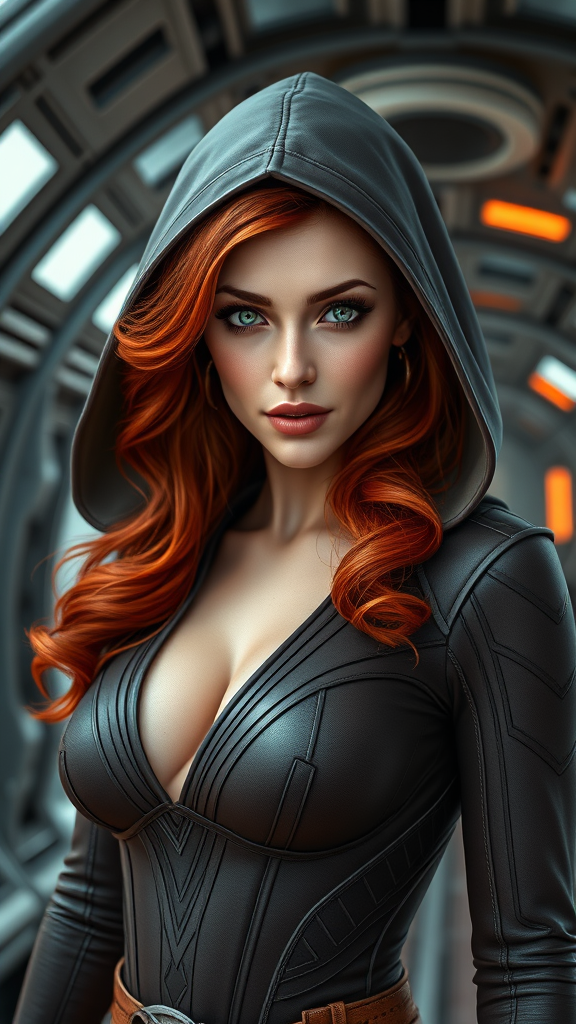 A photorealistic image of a mesmerizing redhead with striking green eyes fixed on the viewer, exuding confidence in a futuristic space station. She wears a sleek, form-fitting Jedi-inspired suit with a graceful hood, highlighting her curvaceous figure. Her captivating assets include voluminous red hair, plump lips, and a daring neckline that teases beneath her outfit. The suit's design emphasizes her lithe physique, with intricate patterns drawing the eye to her athletic form. Minimal makeup accentuates her inherent beauty, as she presents an unwavering gaze filled with calm assurance toward the viewer.