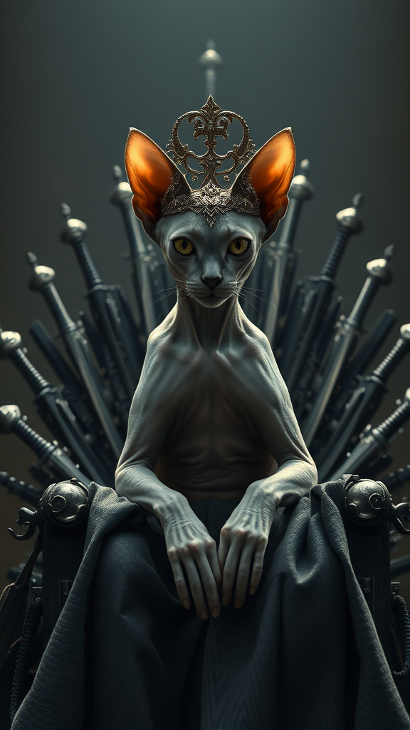 A photorealistic image of a regal hairless sphinx cat exuding an air of power and authority, portrayed as a queen in the style reminiscent of Cersei Lannister from Game of Thrones. The cat is adorned with an intricately designed crown, sitting majestically on a throne constructed from a multitude of intricately intertwined swords. The scene is enveloped in dramatic cinematic lighting, highlighting the sharp contrasts and adding depth to the composition, capturing the grandeur and intensity of the moment. The atmosphere is imbued with a sense of intrigue and medieval opulence, drawing the viewer into a world of fantasy and power struggles.