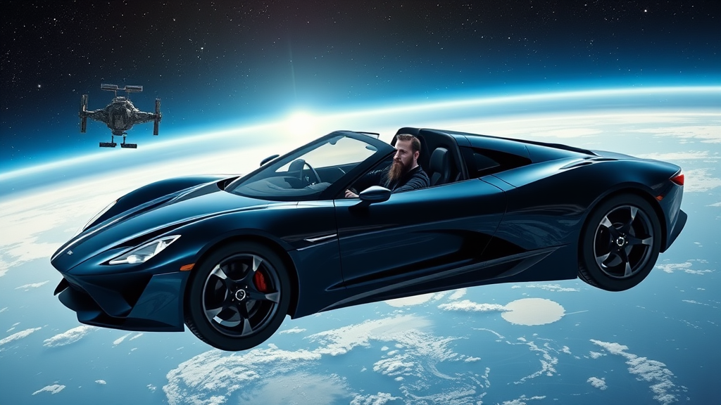 A photorealistic image of a sleek, dark blue car in a weightless state as it approaches a space station. The scene is set against a breathtaking sky filled with stars, with Earth visible in the background. The spaceship design of the car is captured in incredible 8k detail, emphasizing its futuristic elegance. Two individuals with expressive faces, one with a long beard and the other with a motorbiker vibe, can be seen within the car. Elements of conceptual design are at play, with a hint of Ironman inspiration. The composition includes fine details such as pointed footwear, intricate shoe laces, and imaginative traits like an exaggerated head size. Despite minor artistic liberties, the overall visual maintains superb anatomical balance and stunning color contrasts, avoiding any disfigured or mutated aspects to ensure a cohesive and captivating portrayal.