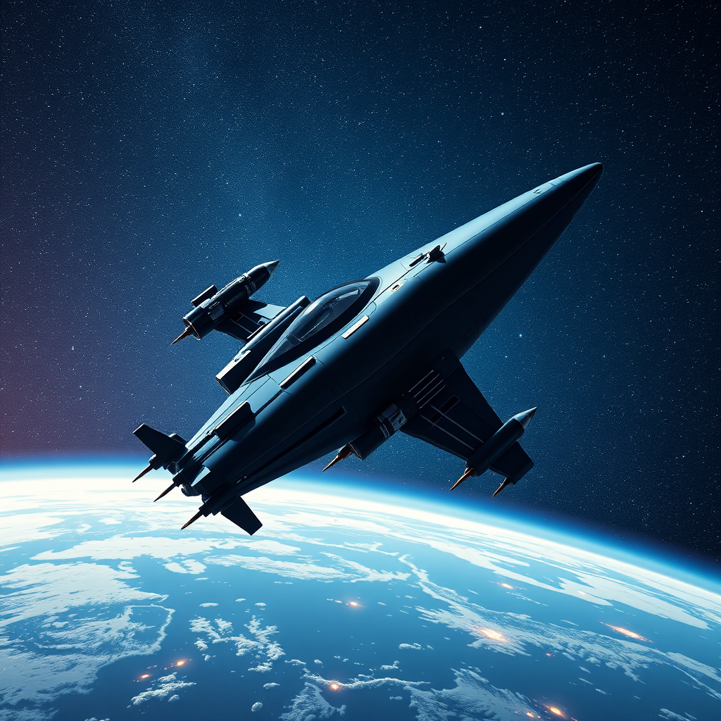 A photorealistic image of a spaceship in a weightless state, exhibiting incredible detail and vibrant colors as it approaches a space station. The scene captures the vastness of space with the sky adorned by countless stars and a breathtaking view of Earth below. The spaceship sports a sleek design in dark blue tones, seamlessly moving towards the orbiting station. The composition is awe-inspiring, showcasing the intricate complexities of the spacecraft and its interaction with the cosmic environment. Elements such as Ezequiel Montalt's car design influence, dual faces concept, and elements of futuristic apparel like Ironman suits and biker gear subtly appear, offering a fusion of high-tech and imaginative design. Key details include distinctive footwear, shoes with pointed ends, and a dynamic stance reminiscent of motorbikers. The scene maintains a balance of futuristic fantasy and attention to anatomical precision, avoiding uncanny distortions or artistic errors, ensuring a coherent and captivating futuristic spectacle.