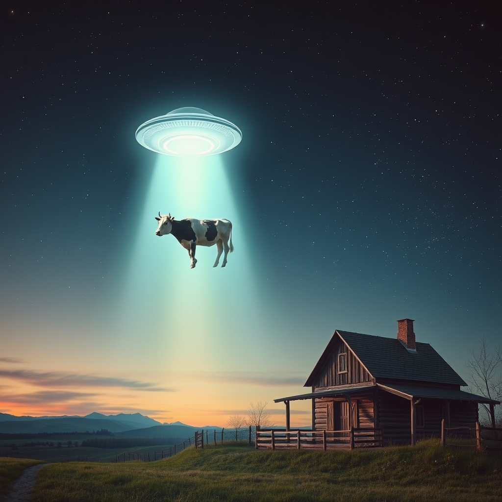 A photorealistic landscape depicts a surreal scene with a cow gently levitating in a shimmering beam of light, suspended several feet beneath a glowing UFO gliding through the twilight sky. The ethereal atmosphere is infused with an otherworldly, dreamlike quality reminiscent of zen buddhism's serene tranquility. In the background, a rustic farmhouse stands quietly under the vast expanse of stars, bathed in the mysterious light. The colors and textures evoke Die Brücke's expressive style, merging with the fantasy of fictional landscapes. This surreal vision is both mystical and rooted in the strange beauty of an imagined rural night.