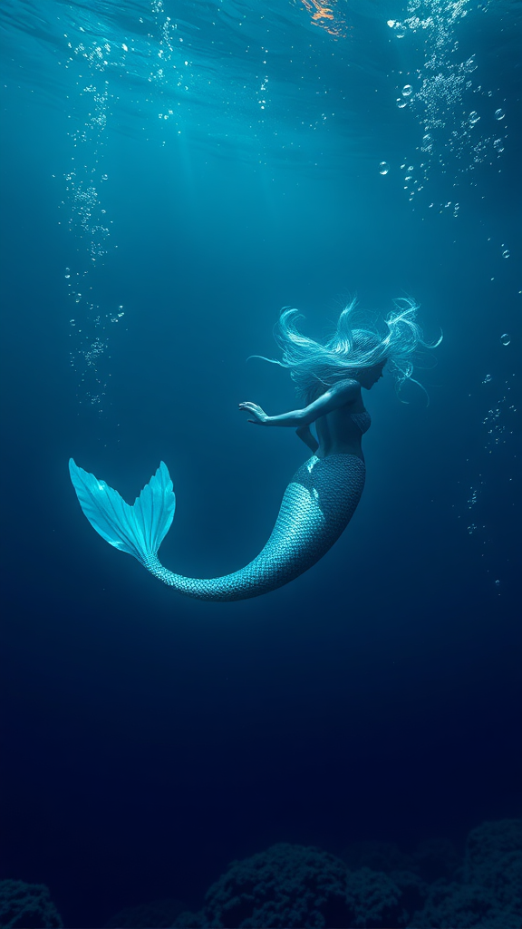 A photorealistic mermaid gracefully swims through the depths of the ocean, surrounded by shimmering air bubbles, her tail glistening in shades of iridescent blue and green. The scene is illuminated by cinematic lighting, casting a floodlight effect that enhances the ethereal glow of the ocean's surface above. Her flowing hair dances in the water, reflecting light blue hues, as she glides effortlessly through the serene underwater landscape, creating a captivating and otherworldly atmosphere, in an 8K resolution, showcasing the majesty of the marine world.