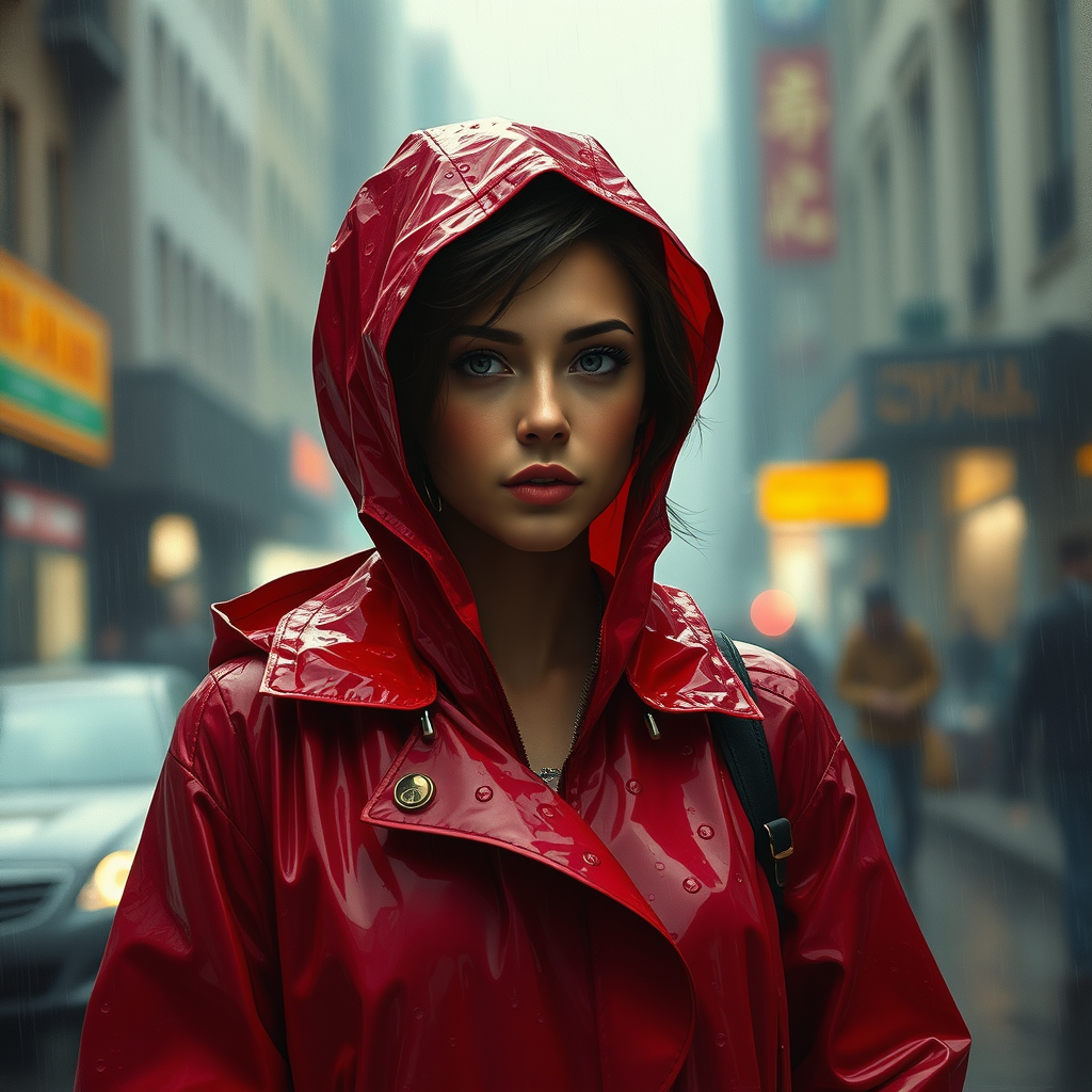 A photorealistic painting by Hedi Xandt, capturing a woman with an enigmatic expression standing in the rain, wearing a vibrant crimson raincoat that glistens under the soft, muted light. The background of the scene shows a bustling city street, blurred with motion to emphasize the solitary figure. Raindrops elegantly arc through the air, caught in mid-fall, adding dynamic contrast to the stillness of her composed stance. The art exudes a cinematic quality, with textures and colors finely detailed, making it resemble a high-definition photograph taken with a Nikon D750. This captivating piece combines the essence of art photography with the precision of Redshift rendering, as if featured on cg society and behance, bringing the viewer into an immersive, almost tangible moment in time.