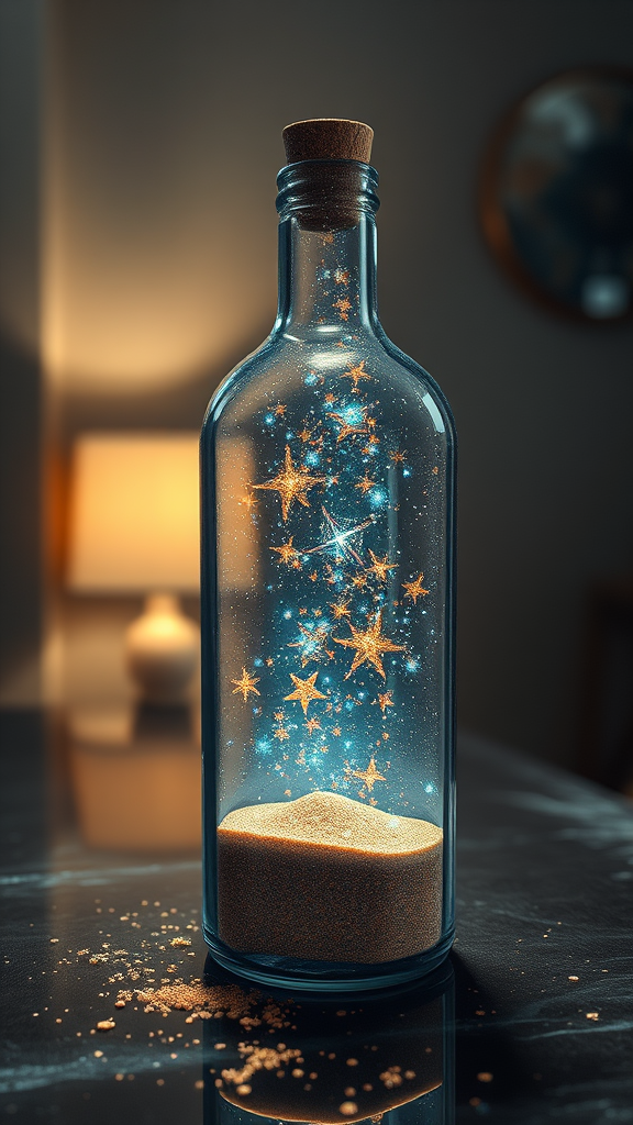A photorealistic painting depicting a glass bottle sitting on a table, capturing the essence of conceptual art with stars and galaxies swirling within. The scene is rendered in high detail, showcasing modern fantasy elements and intricate light effects. The bottle is adorned with glittering multiversal ornaments, encapsulating the universe in a grain of sand. The composition is enhanced through expert photo manipulation, resulting in a beautiful and mesmerizing display of cosmic wonder.