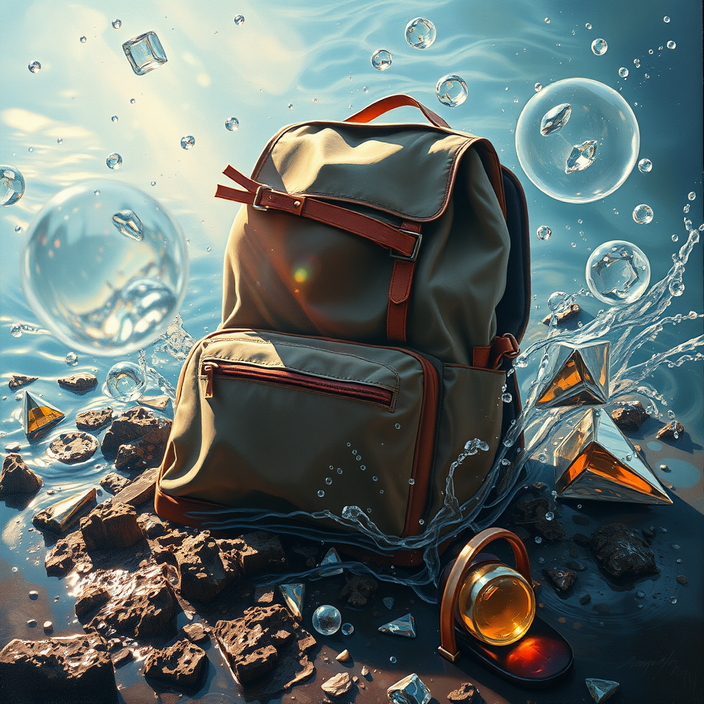 A photorealistic painting featuring a school bag surrounded by elements of water, dampness, and dirt, capturing the essence of refraction, reflections, mirrors, and prisms. Sunlight dances across the scene, with glowing lights adding an ethereal touch. This oil painting is high contrast, intricately detailed, smooth, and sharply focused, drawing inspiration from the styles of Ed Blinkey, Atey Ghailan, and Studio Ghibli, with influences from Jeremy Mann, Greg Manchess, Antonio Moro, and Alphonse Mucha. The artwork embodies a dramatic, photorealistic quality, trending on ArtStation and CGSociety, showcasing intricate details and sharp focus. Creative visuals are enhanced by a touch of surrealism with unusual colors.