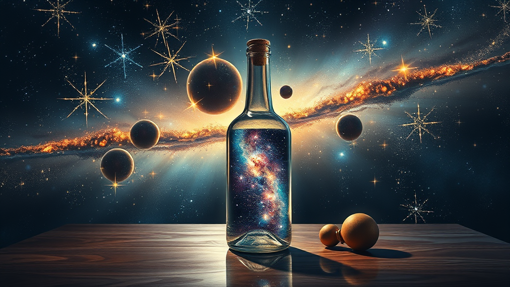 A photorealistic painting of a glass bottle resting on a table, surrounded by a stunning conceptual art setting capturing stars and galaxies. The scene is rendered with high detail and dynamic lighting effects, embodying modern fantasy with glittering multiversal ornaments. The universe is encapsulated within the bottle, as if holding a galaxy in a grain of sand. The composition is enhanced through expert photo manipulation, resulting in an exquisite visual narrative reminiscent of beautiful cosmic wonders.