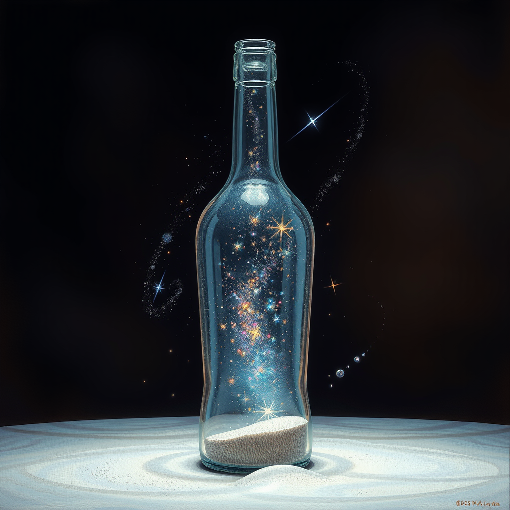 A photorealistic painting of a glass bottle resting on a table, conceptual art style, capturing stars and galaxies within its transparent curves, with highly detailed rendering and captivating light effects. This modern fantasy scene features glittering multiversal ornaments swirling around the bottle, showcasing a universe within a grain of sand. The composition is beautifully manipulated to blend reality and imagination, creating an enchanting and mesmerizing tableau.