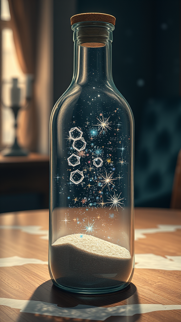 A photorealistic painting of a glass bottle resting on a table, capturing the essence of stars and galaxies within the transparent confines. The scene is a testament to modern fantasy, with light effects casting shimmering patterns across the surface. Glittering multiversal ornaments swirl inside the bottle, illustrating the concept of a universe in a grain of sand. The composition is enhanced by intricate details and expert photo manipulation, creating a beautiful and mesmerizing visual.