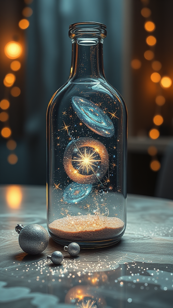 A photorealistic painting of a glass bottle resting on a table, featuring stars and galaxies swirling inside it; highly detailed with perfect rendering; light effects that create a modern fantasy ambiance; glittering multiversal ornaments adorn the scene; reminiscent of a universe contained within a single grain of sand, enhanced by expert photo manipulation for a breathtaking composition.