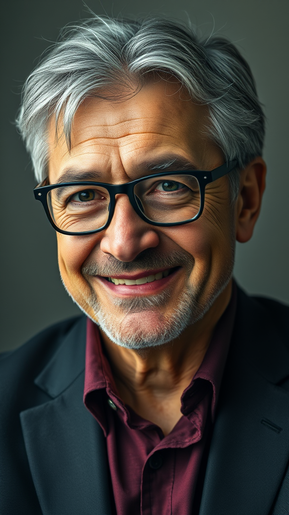 A photorealistic portrait captures a middle-aged adult male, embodying both wisdom and a warm confidence. His presence is magnetic, a harmonious blend of worldly experience and genuine friendliness. His smile reveals a profound understanding, infused with gentle kindness. His hair, speckled with grey, is impeccably styled with dignified ease, suggesting a man who appreciates appearance without succumbing to vanity. Resting on his face are modern, rectangular spectacles with a subtle frame, enhancing his intellectual yet approachable look. They accentuate his rich, warm brown eyes, full of stories, beckoning the viewer with a single glance into his world. He wears a refined, dark blazer, reflecting his professional competence, paired with a pristine maroon shirt that lends a touch of approachable refinement. Soft, defined lighting graces his face, accentuating the honest contours of his life-marked skin, the gentle creases around his eyes indicative of years filled with laughter and thoughtfulness, and subtle stubble on a strong jawline, hinting at his everyday humanity. Every detail of his appearance, from his casually sophisticated attire to the well-chosen glasses, conveys the image of a man as nurturing as he is knowledgeable, as grounded as he is inspiring. The atmosphere around him radiates understated elegance, cultivating a sense of trust and admiration.
