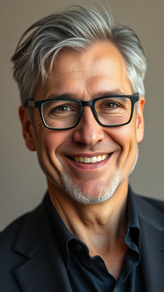 A photorealistic portrait captures a middle-aged adult male, exuding wisdom and a welcoming confidence. His presence is magnetic, embodying a blend of rich experience and approachable warmth, with a smile that speaks of deep insight and gentle kindness. His hair, a mix of salt and pepper, is immaculately styled with a dignified ease, reflecting a man conscious of appearance but free from vanity. Resting on his face are modern, rectangular glasses with a subtle frame, enhancing his intellectual yet approachable appearance. They frame his warm, deep brown eyes, filled with stories and inviting a shared journey with a single look. He wears a tailored, dark-colored blazer that signifies his professional savvy, layered over a sleek navy shirt that adds a touch of approachable sophistication. The lighting softly accentuates his face, thoughtfully highlighting the authentic textures of his life-marked skin, the faint lines around his eyes that suggest years of joy and contemplation, and the subtle hint of stubble along his strong jawline, reflecting his everyday authenticity. Every element of his appearance, from the effortless elegance of his attire to the deliberate placement of his glasses, is crafted to project someone who is nurturing yet knowledgeable, grounded yet inspiring. The environment around him radiates understated elegance, fostering a sense of trust and admiration.