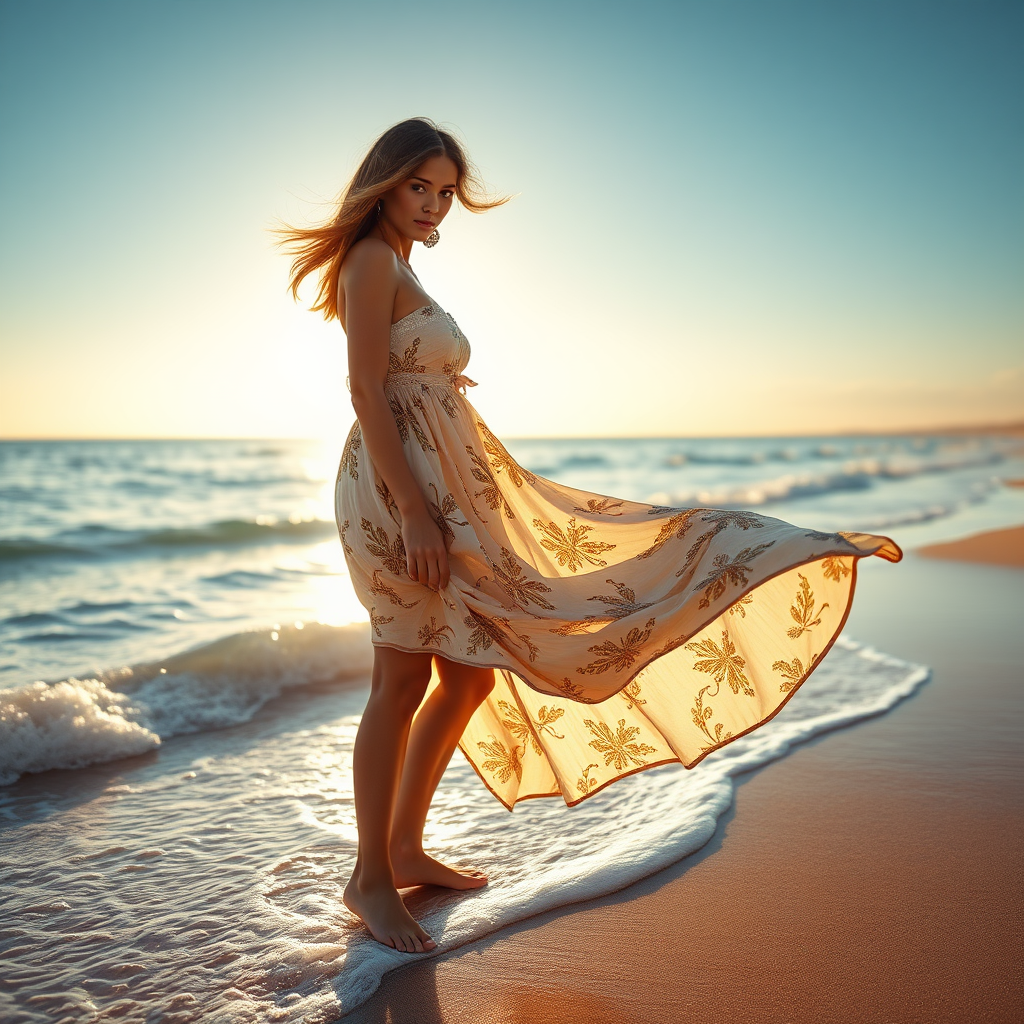 A photorealistic portrait of a Brazilian supermodel standing on a sunlit beach with gentle waves lapping at the shore, captured in optimal photography that highlights her full body in natural lighting, with a soft ocean breeze gently tousling her hair, wearing a flowing summer dress that dances with the wind, bright and vibrant colors reflecting the tropical setting, sky painted with hues of early morning or late afternoon blending seamlessly with the horizon.