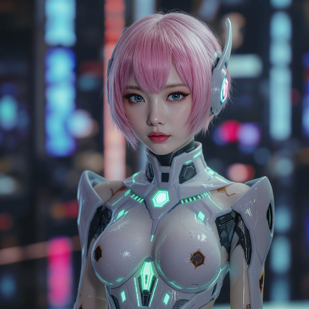 A photorealistic portrait of a girl with a futuristic outfit in an intricate, sleek, and transparent style. She has a young, beautiful face with short, blunt-banged pink hair, a narrow waist, and slender thighs. Her outfit blends elements of Evangelion and cyberpunk aesthetics. The scene is rendered with extreme detail, intricate design, cinematic lighting, and sharp focus, shot with a DSLR camera. It features depth of field and a bokeh background effect, captured in ultra-high-definition with HDR quality, resembling RAW cinema stills. Her skin texture is finely detailed, with remarkable pupils, giving a lifelike essence. The artwork is shot with a cinematic lens, presenting her as a futuristic icon with elegance and precision.