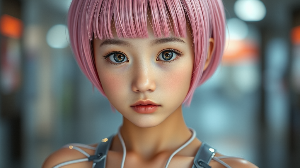 A photorealistic portrait of a young girl with a striking face, featuring short pink hair with blunt bangs and a futuristic outfit that combines sleek, transparent elements drawing inspiration from Evangelion and cyberpunk aesthetics. Her figure highlights a narrow waist and slender thighs. The image focuses on extreme detail, showcasing intricate textures, cinematic lighting, and sharp focus reminiscent of a DSLR shot. The background includes a bokeh effect to emphasize depth of field. Her skin is textured, and her eyes display remarkably detailed pupils. Her expression captures a candid, cinematic quality, akin to being shot with a high-end cinematic camera. The style retains vibrant colors and maintains an emphasis on clean, sophisticated design, avoiding unrealistic or exaggerated features to ensure a balanced and cohesive portrayal.