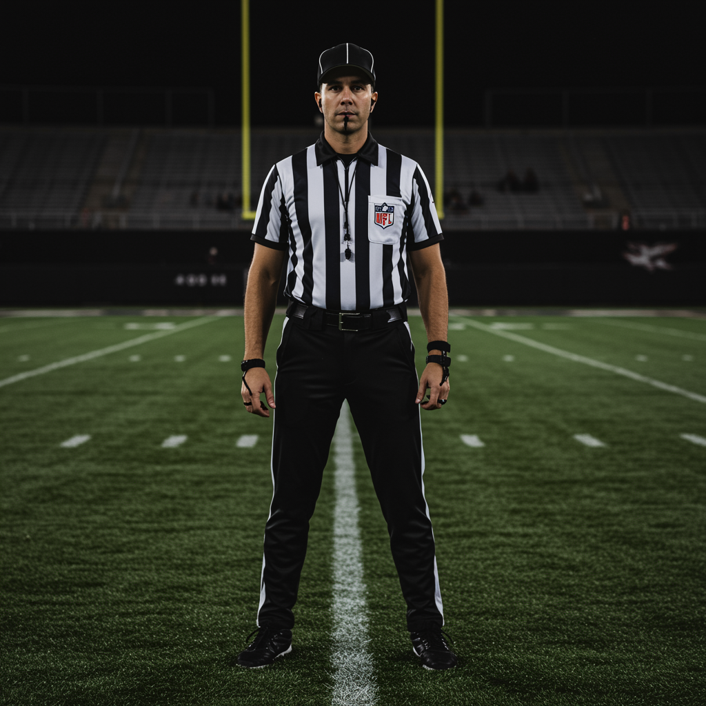 A photorealistic portrait of an attractive football referee standing on the field, perfectly centered and looking straight at the viewer. The image captures the referee in full-length, highlighting detailed realistic skin and utilizing soft, diffused lighting to create a hyperrealistic effect. Photographed in 8k resolution, the scene has a sharp focus and a shallow depth of field, with cinematic CGI lighting enhancing its lifelike quality. The artistry ensures a high-detail raw color look, avoiding any low-quality elements like blurriness, mutations, or distorted anatomy, ensuring a flawless and captivating image.