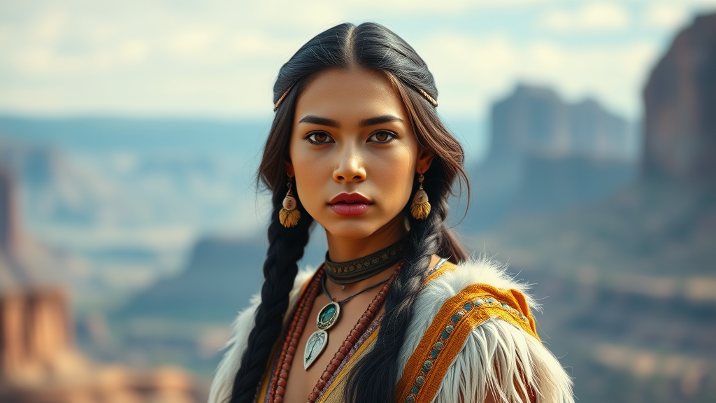 A photorealistic portrait of Madison Beer as Pocahontas, depicting a young, beautiful Native American woman with a perfectly symmetrical face. She wears exquisite feather jewelry and a traditional handmade dress, embodying a fierce female hunter warrior. The setting is a breathtaking Utah landscape, captured in ultra-realistic detail and concept art style. Her elegant stance is enhanced with a thoughtful depth of field, capturing the essence of her environment. Influences of Artgerm, Greg Rutkowski, and Alphonse Mucha are evident in the artistic style. Her visage is framed by dark hair and accented with delicate white fur and luxurious gold fabric. The composition avoids distortion, extra limbs, or additional heads, focusing solely on her singular, captivating presence in a serene and powerful depiction.