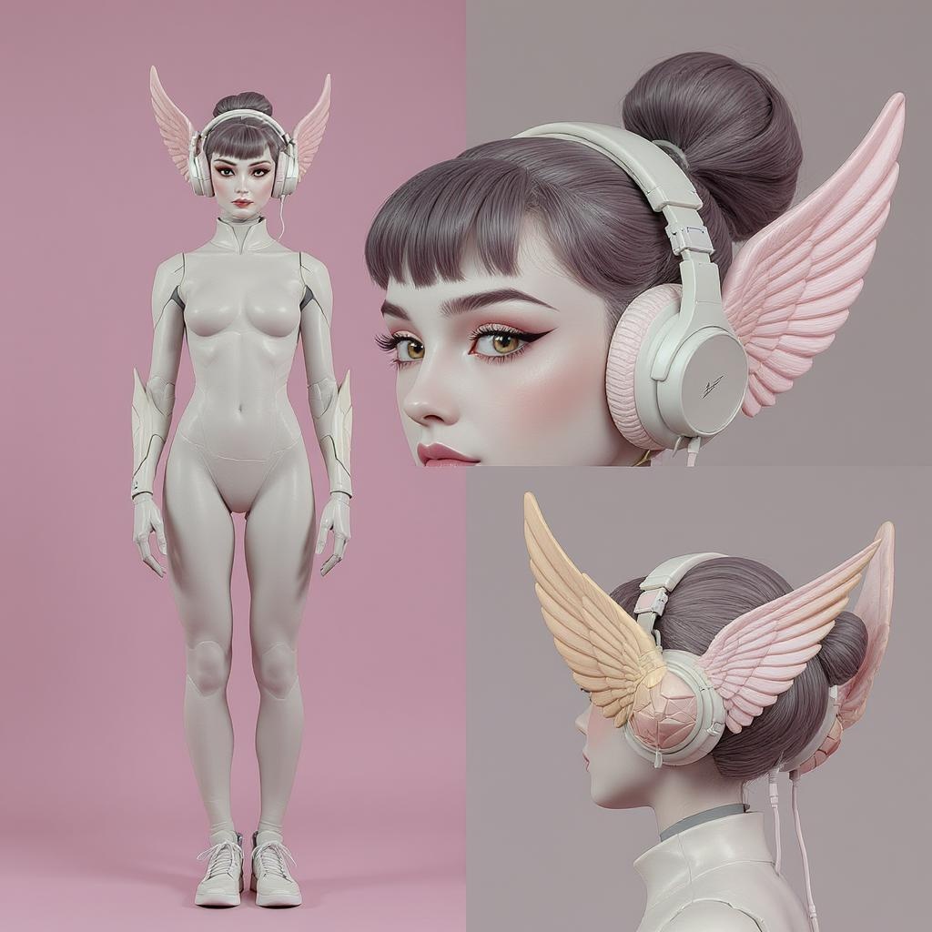 A photorealistic portrayal of a person adorned with winged headphones, featuring surreal sculpture elements in pastel colors, inspired by the works of Jeonseok Lee. The figure embodies a modern twist on Korean Audrey Hepburn and adds an automata essence with 2020 fashion influences. This character showcases innovative headphone designs resembling those seen in game characters, presenting a full body and head view. Infused with the artistic style of Sascha Schneider, the subject has an animalistic head aesthetic, blending realistic cartoon features with airbrushed textures. The imaginative composition includes mind-bending attributes, merging human and tank-like characteristics, complemented by a distinctive hairband.