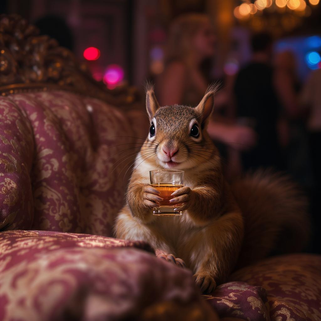 A photorealistic scene depicting a lively squirrel at a bustling party, delicately holding a tiny whisky glass, its eyes gleaming with mischief. It's perched on a lavishly detailed, plush sofa with intricate patterns woven into its fabric. The texture of the squirrel's fur is exquisitely rendered, capturing every strand in hyperrealistic detail. The background showcases a vibrant party atmosphere, with ambient lighting and shadows adding depth. The setting is designed in 8k resolution, providing a wide-angle view in a 16:9 aspect ratio, encapsulating the squirrel's spirited presence amidst the opulent surroundings.