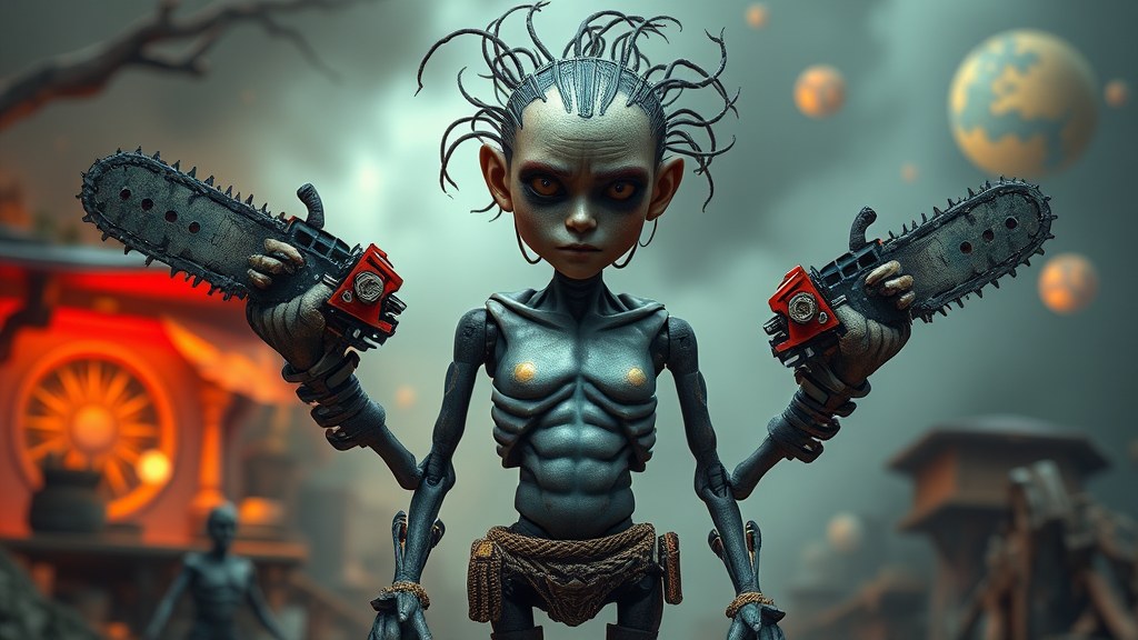A photorealistic scene featuring a humanoid figure with chainsaw arms and distinct, intricate details set in an imaginative environment. The subject displays an intense expression, with a focus on creative abstraction and fantasy elements. The composition plays with surreal anatomy, including unconventional limb arrangements and playful, exaggerated features. This figure stands in a dramatic pose to emphasize the artistic vision, offering a unique blend of fantasy and a hint of the bizarre, while maintaining a visually engaging and thought-provoking aesthetic. The background and character design reflect a fusion of photorealism and creative whimsy, captured in high-definition for an immersive viewing experience.