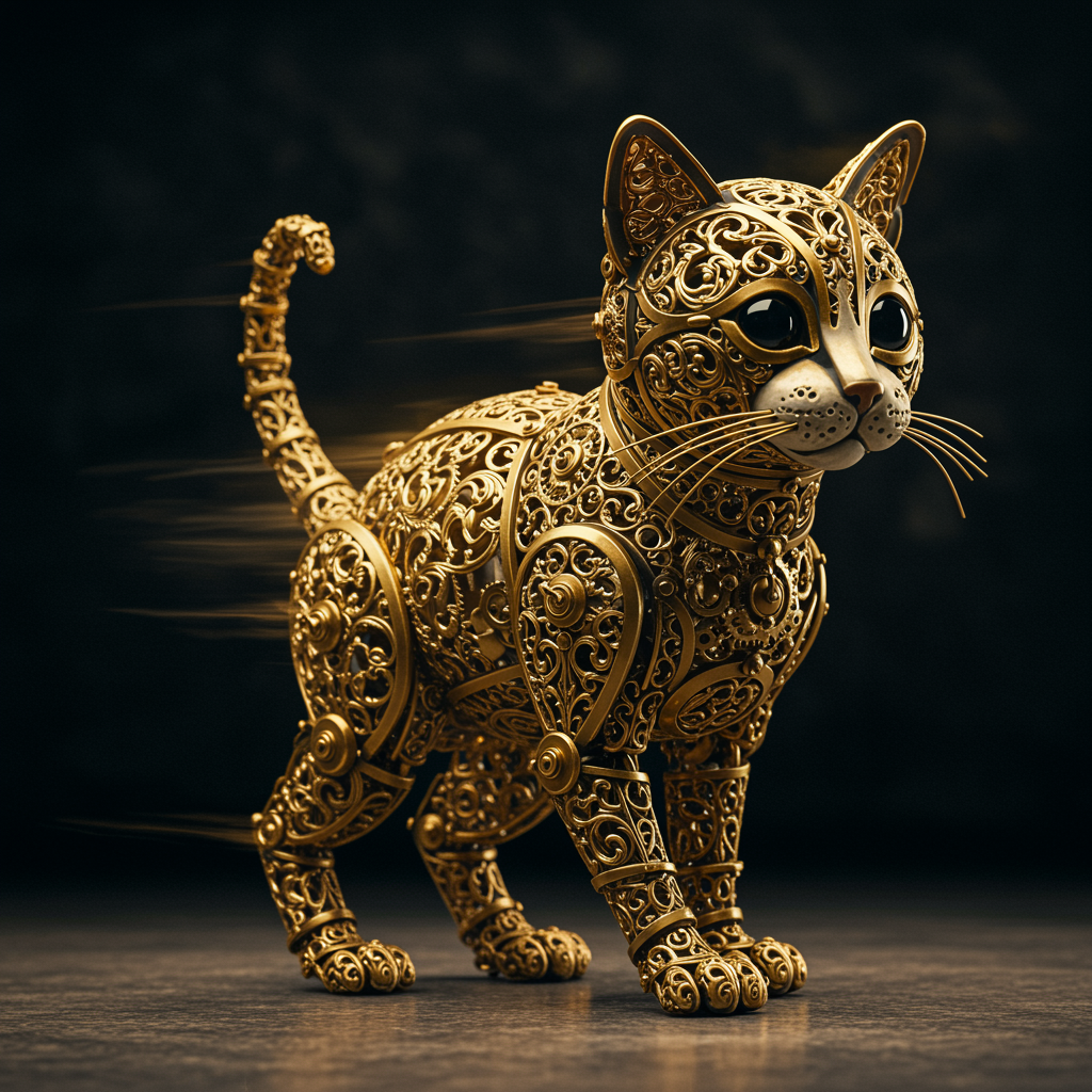 A photorealistic scene featuring a kitten crafted from intricate gold clockwork, adorned with exquisite golden filigree, set against an abstract dark backdrop. The composition emphasizes chiaroscuro to highlight the delicate details of the mechanical feline. Captured with high detail and hyper-realism, the image conveys a sense of dynamic acceleration through long exposure, with cinematic quality in 8K HD super resolution. The frame maintains a balanced 1:1 aspect ratio, ensuring the clockwork kitten remains the focal point, with subtle creative elements enhancing the original concept.