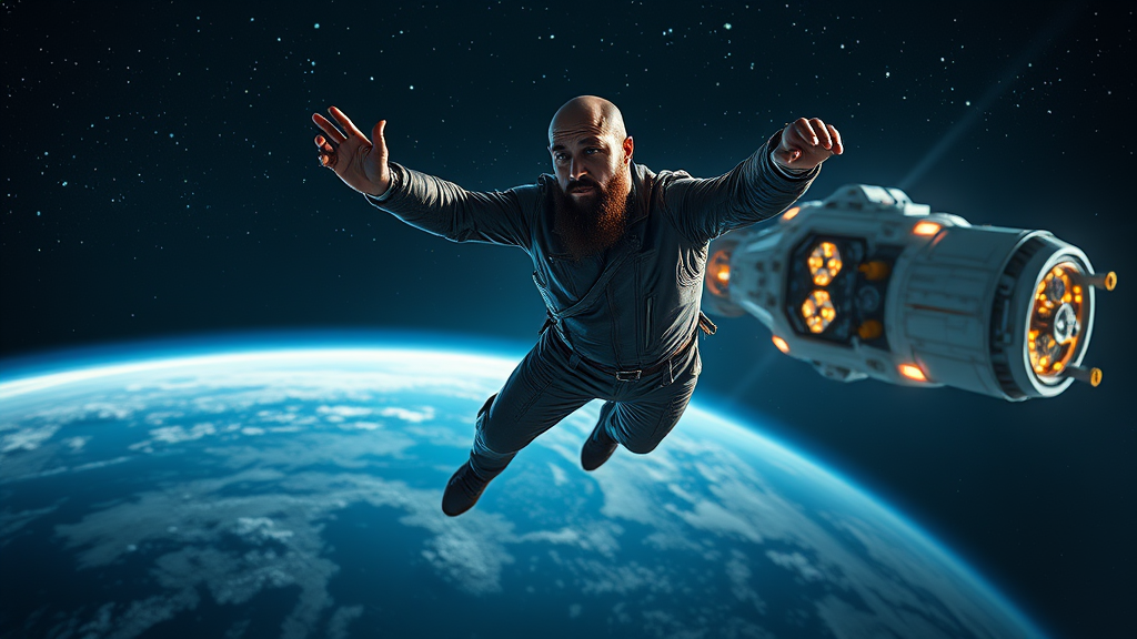 A photorealistic scene featuring a man in a weightless state, floating effortlessly towards a space station. The imagery captures the vastness of space with stars glittering against the dark blues of the cosmos and Earth’s curvature in view. The man, with a sculpted athletic build reminiscent of Matthias Schoenaerts, is positioned near an advanced spaceship design, underlining the sense of exploration and adventure. His leather-clad appearance evokes a motorbiker vibe, adding a dynamic touch to the composition. Soft edges highlight a big head, paired with a strikingly long beard, and his footwear is uniquely pointed. The visual narrative is detailed with elements of bold design and vivid color, expertly avoiding any disfigurement or unusual anatomy, focusing instead on an immersive, high-resolution experience of exploration and technology against the backdrop of deep space.