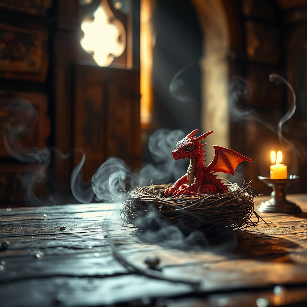A photorealistic scene featuring a small crimson dragon nestled peacefully in a delicate nest, illuminated by soft morning light streaming through an ancient window. The setting is a medieval wizard's table, detailed in rich colors and textures, with faintly swirling steam adding a mystical atmosphere. Captured with a macro lens at f/2.8, the image highlights the warmth and comfort of this fantasy tableau. It evokes the enchanting worlds of LOTR, DnD, and RPGs, rendered in stunning 16K and 8K 3D imagery.