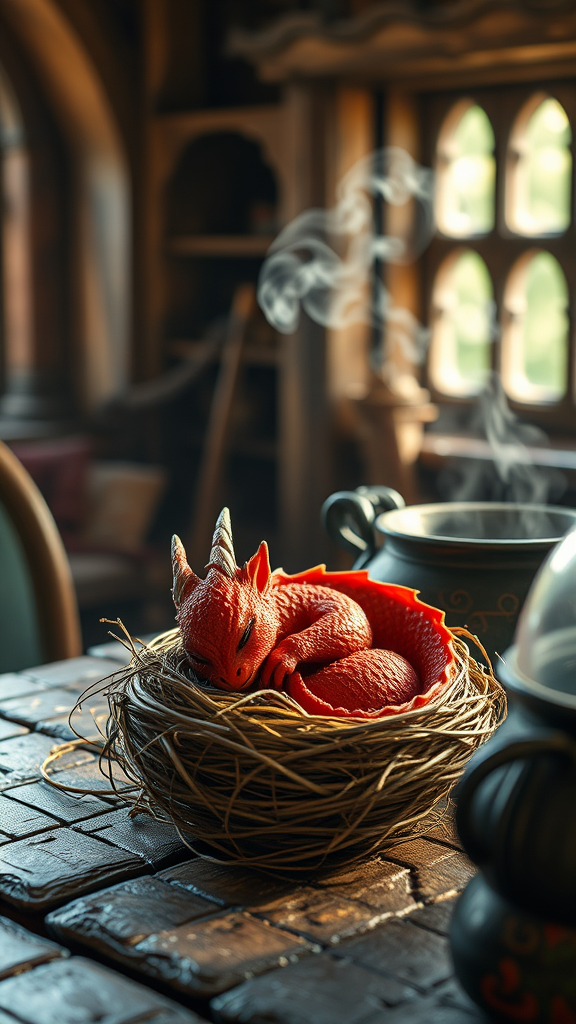 A photorealistic scene inspired by LOTR, featuring a tiny red dragon peacefully curled up asleep in its nest on a medieval wizard's table, captured with a macro lens at f/2.8. Morning light gently filters through a nearby window, illuminating the vibrant colors and casting playful shapes of steam rising from an ancient cauldron. The atmosphere speaks of comfort and intrigue, reminiscent of a DnD RPG setting. Captured in stunning 16K and 8K resolution, this scene invites you into a 3D world filled with mystical charm and wonder.