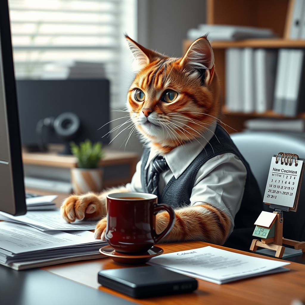 A photorealistic scene of a cat diligently working at an office desk, dressed in professional attire, with high attention to detail, capturing the whiskers and fur texture in 4k quality; the feline is focused on a computer screen surrounded by paperwork and a steaming cup of coffee, showcasing a seamless blend of human-like behavior and feline curiosity, creating a whimsical masterpiece with a 2:3 aspect ratio, adding a playful touch with a small potted plant and a tiny, personalized calendar on the desk.