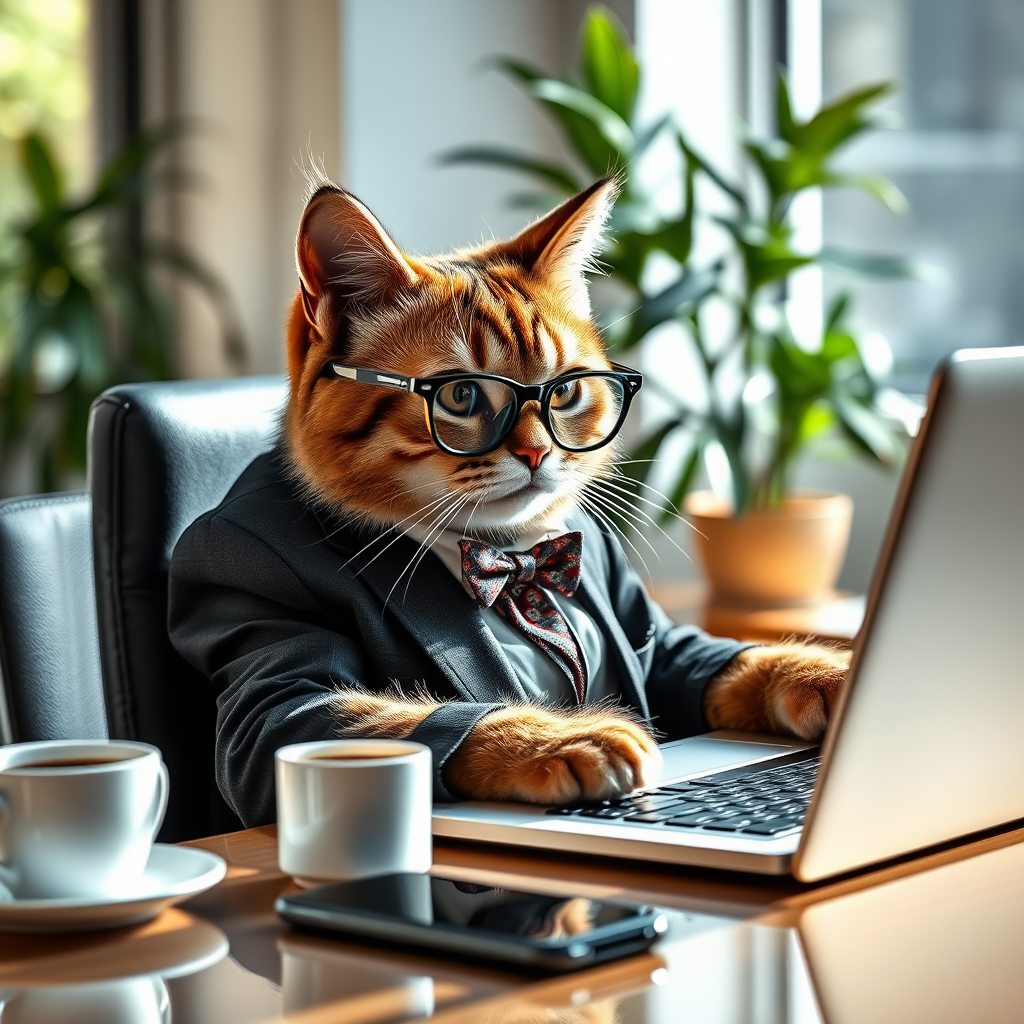 A photorealistic scene of a cat wearing glasses and a stylish suit, diligently working at a modern office desk, with high detail capturing its fur and expressive eyes, a coffee mug beside its laptop and a plant in the background, set in a sunlit room, 4k resolution, a masterpiece in blending animal features with human behavior, --v 5. 2 --ar 2:3.