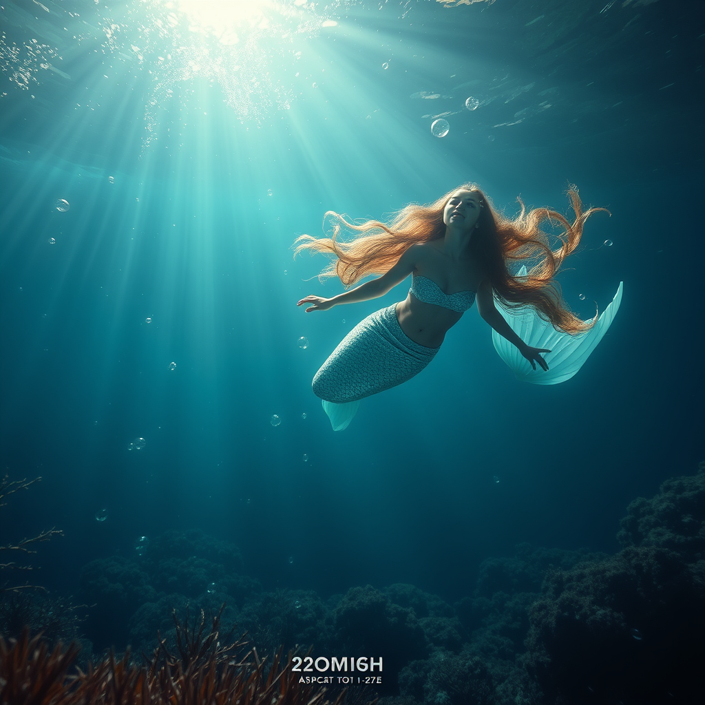 A photorealistic scene of a mermaid gracefully swimming in the deep ocean, surrounded by shimmering air bubbles, her scales reflecting a spectrum of light blue hues. The underwater landscape is illuminated by a floodlight, casting cinematic shadows across the coral and seaweed. Her long, flowing hair dances with the gentle currents as beams of light break through the water's surface, creating an ethereal glow in the crystal-clear environment, captured in stunning 8K resolution, aspect ratio 1:2.