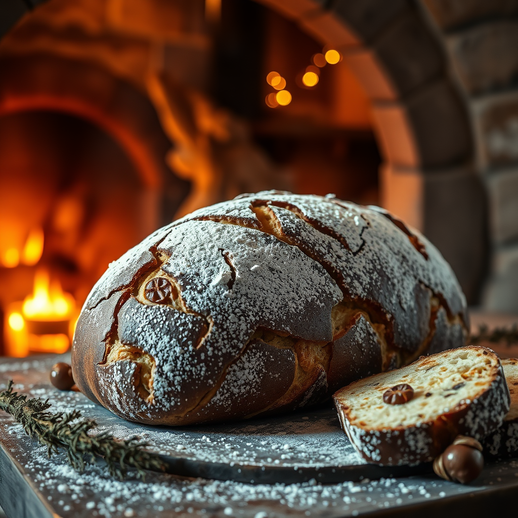 A photorealistic still life captures the cozy ambiance of a wood-burning oven setting, featuring traditional Christmas stollen bread adorned in a black and gold color palette. The scene is bathed in warm, realistic light, emphasizing the intricate details of the stollen's powdered sugar and dried fruit. The background showcases a rustic interior with a harmonious blend of Kinkfolk photography and A+D architecture, encapsulating a sense of homely elegance. The wide-angle view immerses the viewer in a serene holiday atmosphere, inviting warmth and a hint of festivity.
