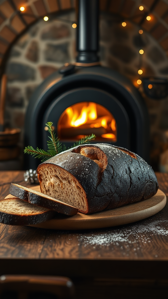 A photorealistic still life featuring traditional Christmas stollen bread arranged on a rustic wooden table, set against a backdrop of a warmly glowing wood-burning oven. The scene is illuminated by soft, realistic lighting that highlights the intricate details of the bread's texture and the charming nuances of the cozy atmosphere. The color palette is dominated by elegant blacks and shimmering golds, enhancing the visual contrast and richness. Captured with a wide-angle lens, the composition embodies the essence of kinfolk photography, integrating elements of A+D architecture with subtle modifications—a delicate sprig of fir and twinkling string lights adding a touch of festive grace.