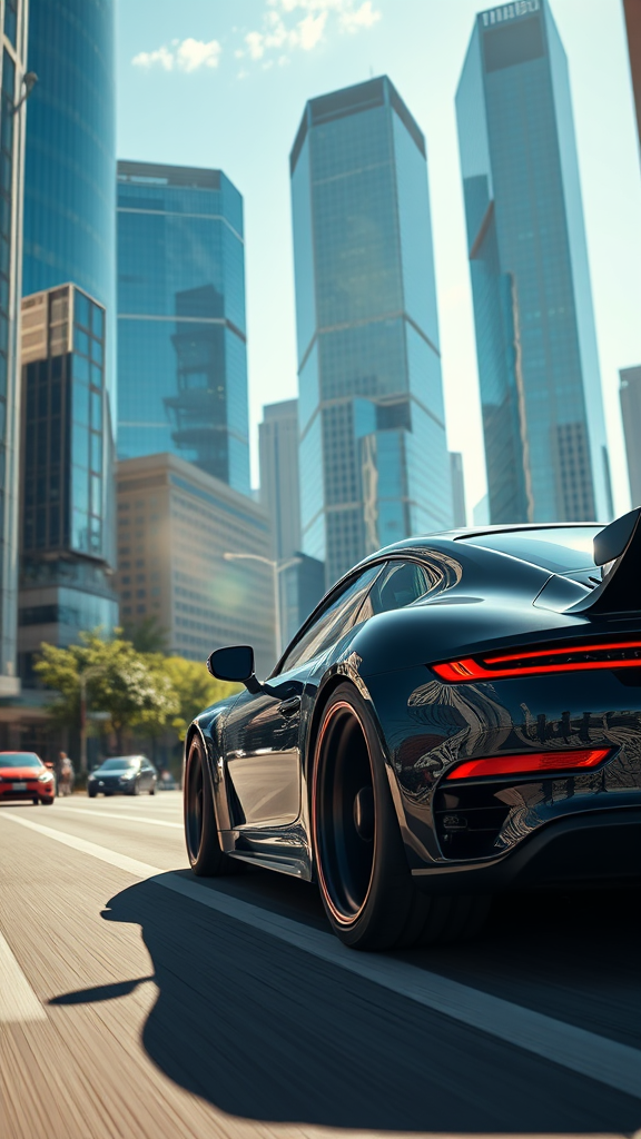 A photorealistic ultra detail of a sleek, custom RUF CTR cruising through an urban landscape at midday, bathed in vibrant sunlight. The cityscape surrounds with towering glass skyscrapers reflecting the bright blue sky, bustling streets, and a hint of greenery from the scattered trees. Shadows play dynamically over the car's glossy surface, emphasizing its aerodynamic lines and precision engineering. The scene captures a cinematic moment showcasing the contrast between the vehicle's classic silhouette and the modern architecture of the city. 8K resolution, dramatic yet balanced, with an artistic flair in the interplay of light and motion.