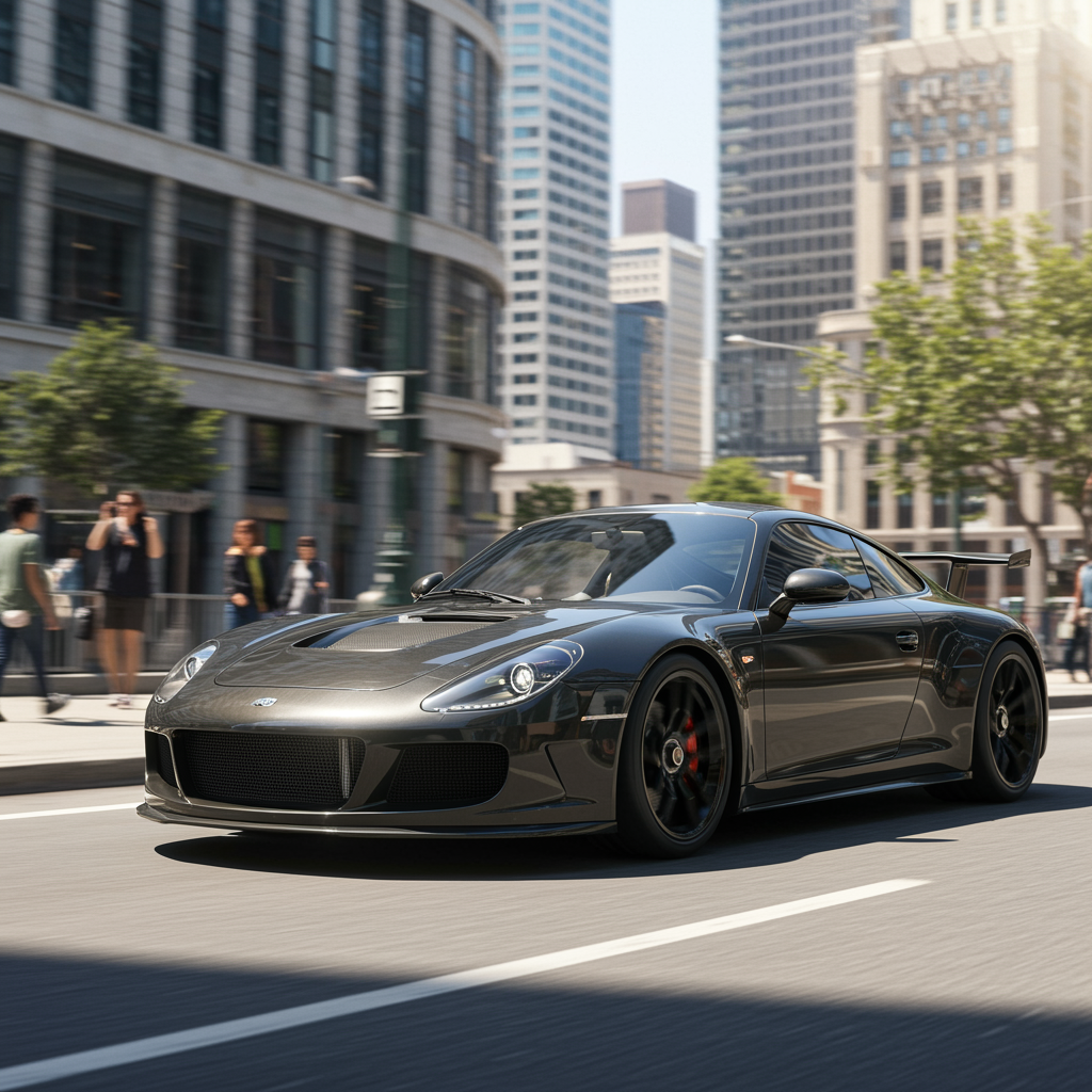 A photorealistic ultra-detailed image of a sleek RUF CTR cruising through a bustling city at noon, the sunlight reflecting off its glossy curves, casting dynamic shadows onto the pavement. Skyscrapers tower in the background, their windows glinting under the bright midday sun. The scene captures a blend of motion and stillness, with pedestrians and vibrant city life in the periphery, their movements slightly blurred to contrast the sharp focus on the car. The whole setting exudes a cinematic quality, showcasing the intricate design of the RUF CTR against the urban backdrop, rendered in stunning 8K detail.
