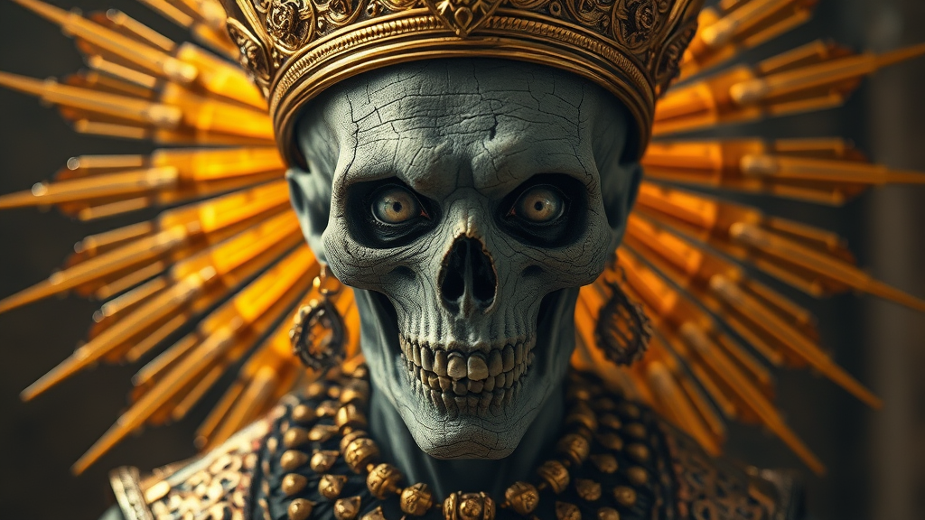 A photorealistic undead monarch adorned with a luminous golden crown and opulent necklaces, surrounded by a radiant golden sunburst headdress, his haunting white eyes devoid of life. The king's skin appears parched and lifeless, embodying an ancient and eerie elegance. Dramatic, high-contrast lighting accentuates the textures of his dry, cracked visage, creating an 8k portrait that captures an aura of regal decay and timeless mystery.