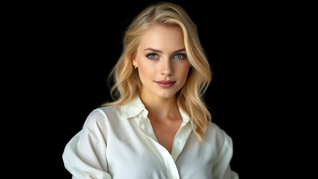 A photoshoot featuring a blonde woman with captivating green eyes, dressed in an elegant white blouse and stylish blue denim, set against a deep black backdrop. The soft lighting casts a gentle glow, highlighting her radiant features and bringing a sense of timeless grace to the composition. The black background emphasizes the simplicity and sophistication of the outfit, creating a striking contrast that draws focus to her confident and poised expression.