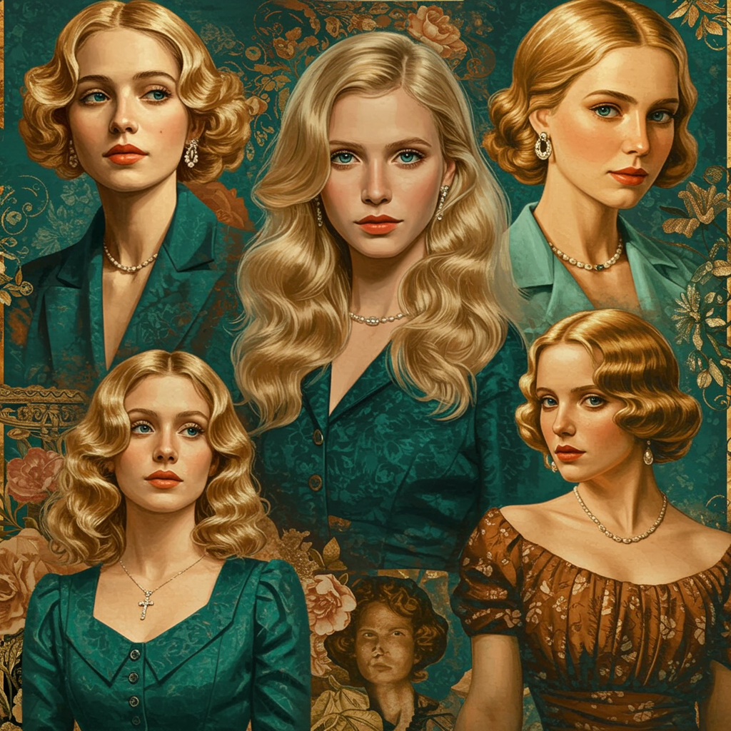 A picture of a blonde woman adorned in varied attire, featuring hues of deep teal and soft amber, displayed in prismatic portraits with 8k clarity. The image is a fusion of artistic styles, reminiscent of Whitcomb girls, bathed in golden light, and presents a medley of celebrity likenesses. The aspect ratio evokes a sense of elegance with a touch of raw authenticity, combining classic and modern artistic elements.
