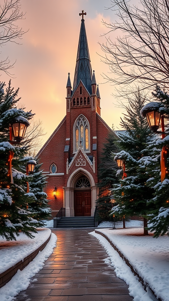 A picturesque Christmas card showcasing the majestic exterior of Kirk in the Hills Presbyterian Church in Bloomfield Hills, MI, enveloped in a serene winter landscape. The church's Gothic-inspired architecture stands gracefully under a blanket of freshly fallen snow, with twinkling lights subtly outlining its iconic spires. Evergreen trees adorned with delicate ribbons and white lights flank the stone pathway leading to the entrance. The setting sun casts a warm, golden glow across the scene, blending with the soft illumination from stained glass windows, creating a sense of rustic luxury and festive tranquility.